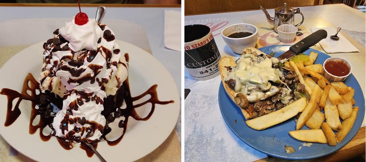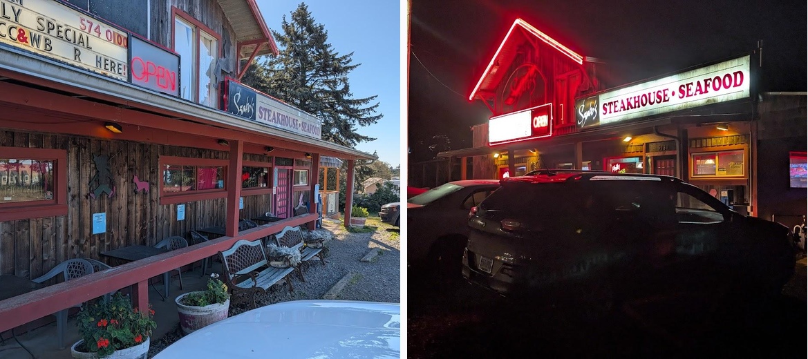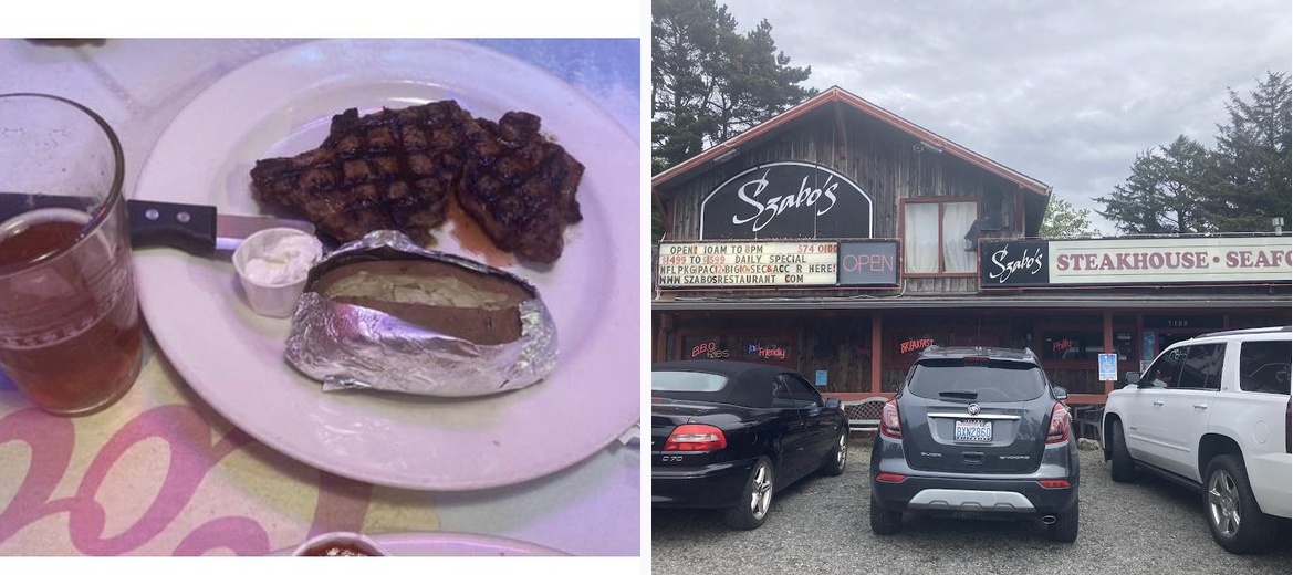 A somewhat rustic roadhouse vibe greets one when entering the Szabo's Steakhouse. As are most establishments on the central Oregon coast... to be found, rustic. We were promptly greeted by a super friendly server who allowed us to choose our preferred seating. We were having a celebratory birthday lunch for my best buddy and this steakhouse did NOT disappoint! I had the Reuben with fries and he had the Halibut fish and chips. My buddy is a rock solid, farm raised meat and potatoes Irishman - who is the pickiest eater I have ever met. But, he loves properly done fish and chips! The portions were generous and piping hot when they arrived at our table - within minutes of our ordering. My Irish friend tore into his plate with great enthusiasm and all but licked the plate clean! Nary a complaint was to be heard from his topically vulgar 69 year old mouth! He wiped away his whiskers, smiled and stated, "Now, I'm ready for a nap!" He yawned continuously until I dropped him off at his door, in Waldport. I was happy he had a solid lunch for his birthday. My Reuben was spot on delicious! Both pieces of bread were properly crusted and the fillings were tender and bursting with flavor! The fries were fried in fresh oil and nothing was greasy! My only complaint was their tea. I could easily taste the fact that the tea is stored in a container that can't be frequently cleaned. So, I only indulged the first sip and passed on the rest. Having said that, it's practically impossible to have "the perfect meal" here on the coast. Bad tea? No worries. The food and everything else was fantastic! Well worth every Penny for my cranky old buddy!