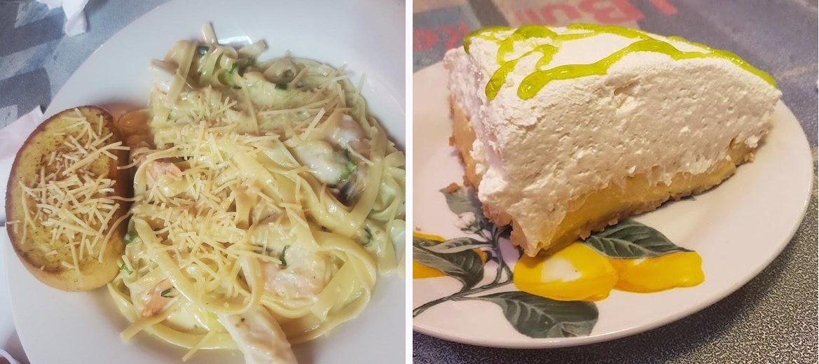 Must-try dishes include the fish and chips, crab cakes, and their famous banana split for dessert. The shredded halibut is also a local favorite.